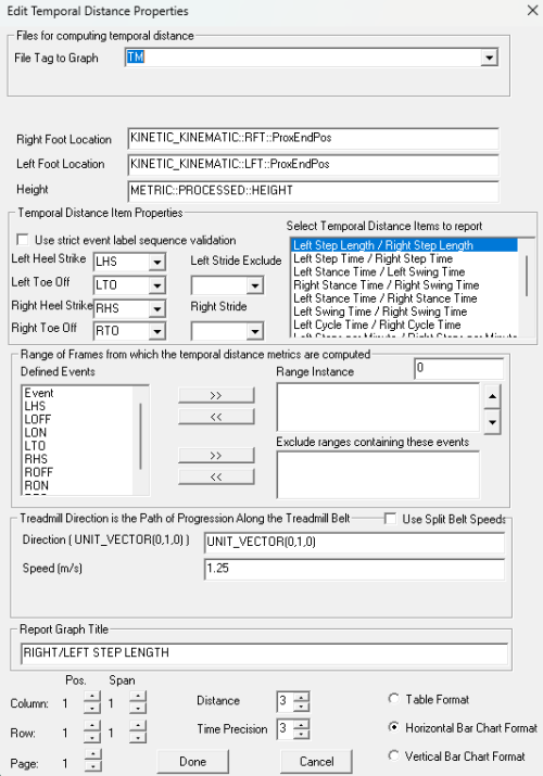 ![]() | - The event labels may be changed to any events desired. - Selecting Strict Event Label Sequence will create temporal distance measures for events that occur within a gait cycle. For example Swing Time which occurs between RTO and RHS will only be calculated if the event sequence is RHS+RTO+RHS. - String Exclude will exclude event sequences with that event. - Explanations of the calculations of the temporal distance items can be found here. |