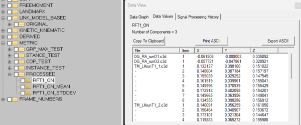 Since Metric_Signal_Value_At_Event outputs all three components, here is a workaround of the previous example that will output one component. Evaluate_Expression is used to create a signal with one component, the z component for RFT1. Then the Metric_Signal_Value_At_Event will calculate the value of the TARGET RFT1 at the Event_Label RON.