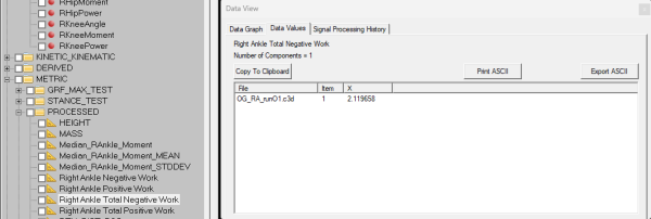 In the example below the Metric Sum command is used to find the total work done by the right ankle by summing positive and negative work done between events.