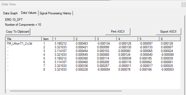 One of the primary applications of the Compute DFT Coefficients command is to perform analysis of analog signals like force readings and EMGs. Here we compute the DFT coefficients for a folder containing EMG and force plate data.